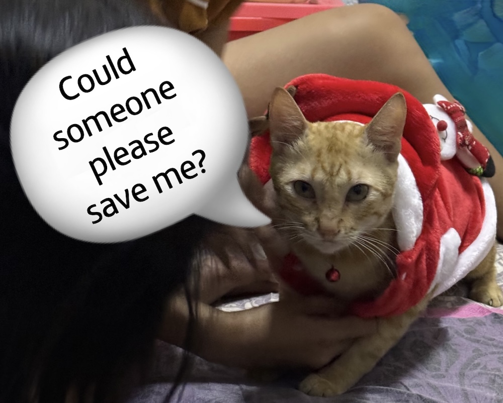 Yes, this is a thing. Not only does Hannah look after a cat, literally, named after me, but this cat is to put up with torture and ridicule on a daily basis. One of the examples of this was how it had to wear a Christmas outfit in the boiling tropical climate of the Philippines. I think if there’s a word I would use to describe the cat, it would be, tolerate. That thing puts up with a lot of pretty rubbish treatment, and, is, essentially, forced to put up with it. But, if it wants food, it’s got to just accept it 😅