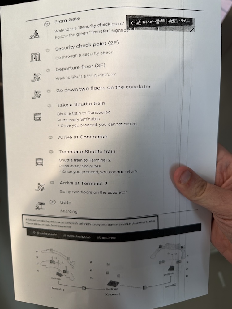 Whilst leaving the Emirates plane, there stood a middle-aged Korean woman with a gleaming smile, holding my name, very slightly printed on a piece of A4. It’s funny, but, I almost walked right past her. I wasn’t expecting it, but, you know, when you’re in a moment of alert, things certainly get highlighted at the end of your eye-line. As much as I tried, bless her, I couldn’t really tell a word she was saying, just smiled back and nodded. But, in the end, I was left with that a piece of paper, shown above, showing the very complex journey I needed to do, in, at this point, a very short amount of time. Of course it was because I didn’t have much time, why she was speaking rather quickly. Trouble is, the instructions were very vague, that’s being generous, and, I was completely clueless what the heck was going on. So, I just walked and hoped for the best. It’s important to point out, at this stage, I was around 50 minutes away from my next flight taking off, and yet to even move. I ran down just looking around aimlessly, I ended up joining a very loonngg queue for looked like Baggage and Immigration. 5 minutes passed and we’d not even moved. I was starting to get worried I was about to miss my next Flight. Looking around whilst waiting, re-reading my Sheet another half-dozen times, it became clear, I was in the wrong place. This was the queue for Arrivals, I’m not arriving, I’m moving on. So, I went for it, pushed past in the queue, and walked down the rest of the completely empty and unassuming line. On the way, a man noticed me, saw my Sheet and was like “go, go”, and I was like, OK, but where? I dared to turn left and continues to follow Transfers. Thankfully, this was the right way to go and there I was, in a sea of Shops. No word of a lie, where we ended up felt like Meadowhall times 3. But, where’s the Train, where’s the Concourse??? I was clueless.